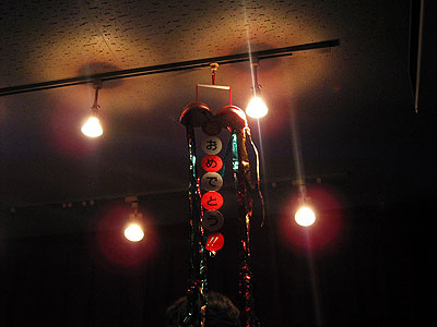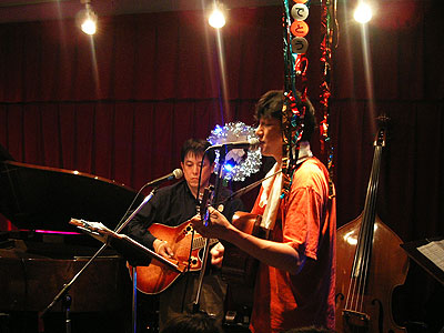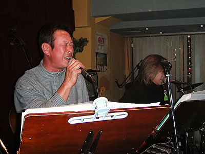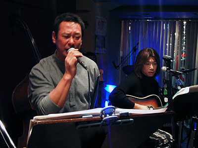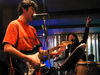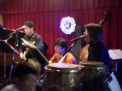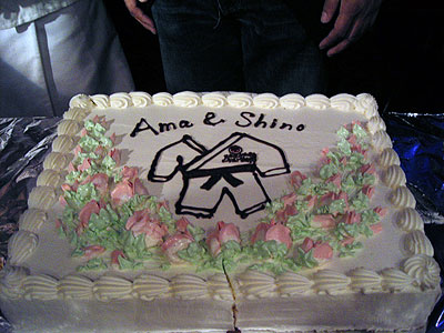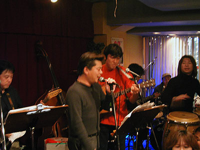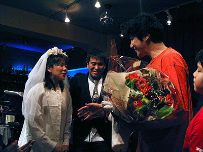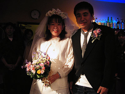 2003年11月22日、二子玉川支部の雨貝さんと篠崎さんの両家の結婚を祝して、三軒茶屋にある"ステージPF"にて「結婚パーティライブ」を開催いたしました。でもこれはサプライズパーティによる完全シークレットで行われました。パーティ会場にトレーナー姿(いわゆる普段着)で現れた二人はそりゃぁもうビックリ!!(その瞬間会場はマジで大受けっ!!)こちらで用意した簡易ドレスに着替えてもらうのですが、この衣装は三沢家にて用意していただいたもの・・・。しかも旦那さんのタキシードは米米時代に使用した実際のMATAROさんの衣装です!!みんなが心を込めて二人のために歌をたくさん送りました。